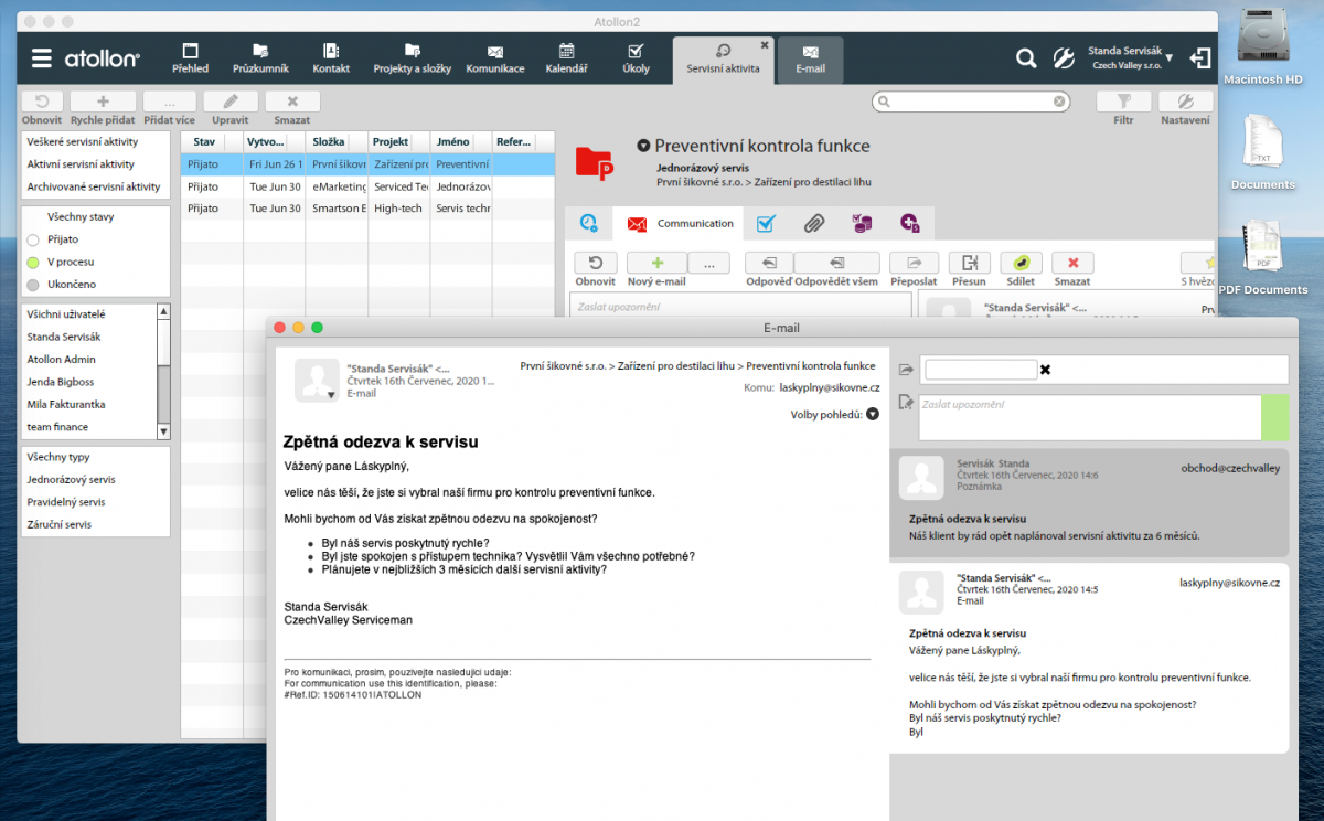 Příčinou nespokojenosti zákazníka bývá často nedorozumnění vyplývající ze špatné komunikace. Díky Atollonu všichní odpovědní pracovníci získají stejný pohled na historii komunikace se zákazníkem - od zadání a naplánování požadavku na servis, až po konečné vyúčtování. Po celou dobu je vhodné, aby zainteresovaní lidé získali přístup k informacím o průběhu poskytované služby. Díky chytré struktuře ukládání dat je komunikace zároveň automaticky dostupná ve chvíli, kdy potřebujete prozkoumat problémy servisované techniky, případně získat rychlý přehled o historii komunikace se zákazníkem nebo s jeho jednotlivými kontaktními osobami.
