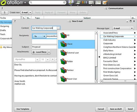 Unlike Outlook, Atollon provides auto-creation of a mailbox for each client and each project or business case in your company, even into the thousands, if necessary. With our solution, it is possible to navigate more easily, as well as send messages from external e-mail systems. Atollon does not only solve context storage, but also storage for other types of reports, starting with the document, sent materials, and invoicing with the appropriate e-mail correspondence.
