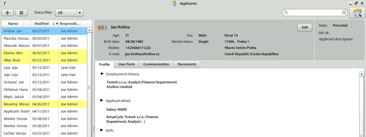 Here is the record of all tenders which the candidate participated in. Again, there are several ways of use. Probably the most important use of this criterion is in the search and ability to trace these ´freshly´ interviewed candidates. At the same time you can see the cause and reasons for rejection of other positions which is very useful information for considering the suitability of a candidate and may lead to the avoidance potential problems.
